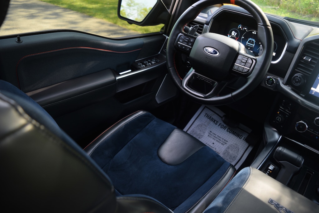 Adaptive suspension, Blue Interior Package, Fully automatic headlights, GVWR: 7,300 lbs Payload Package, Heated front seats, Heated rear seats, Memory seat, Moonroof & Tailgate, Navigation system: Connected Navigation, Pedal memory, Power Tailgate, Radio: B&O Unleashed Sound System by Bang & Olufsen, Recaro Unique Blue Accent 40/Console/40 Front Seats, SYNC 4 w/Enhanced Voice Recognition, Twin Panel Moonroof, Ventilated front seats.